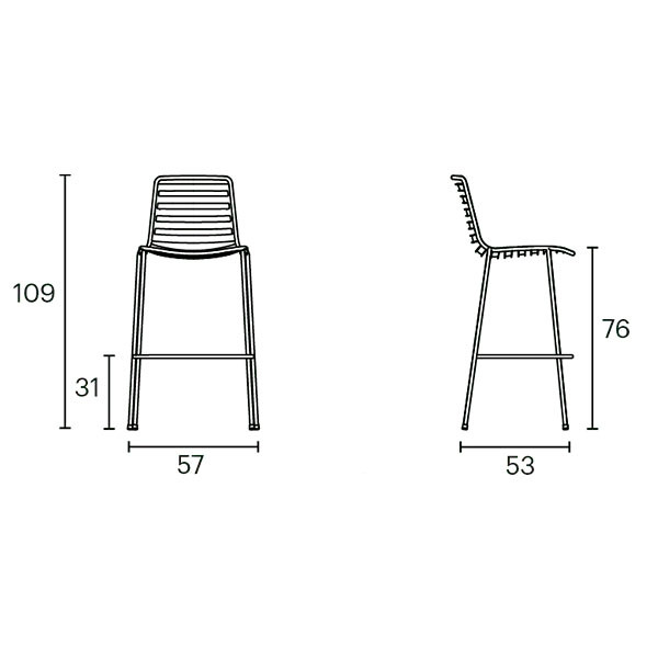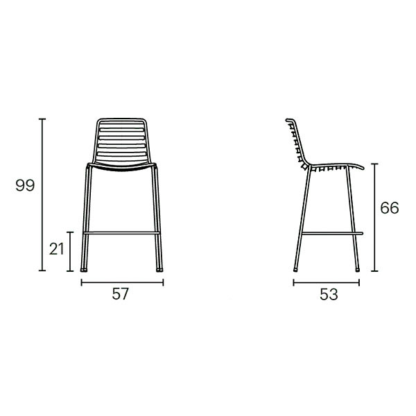 Taburete en tubo de acero moldeado apilable ideal para exterior en dos alturas.