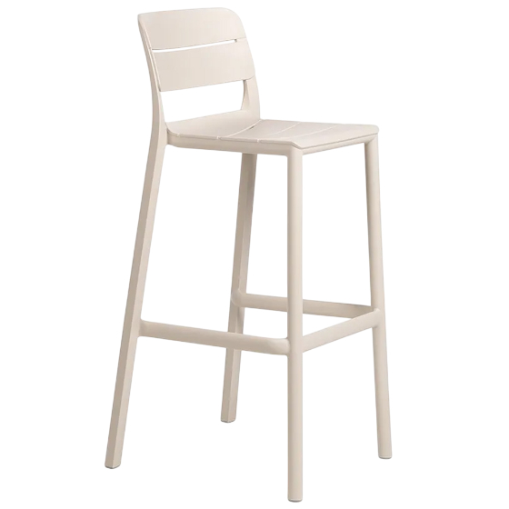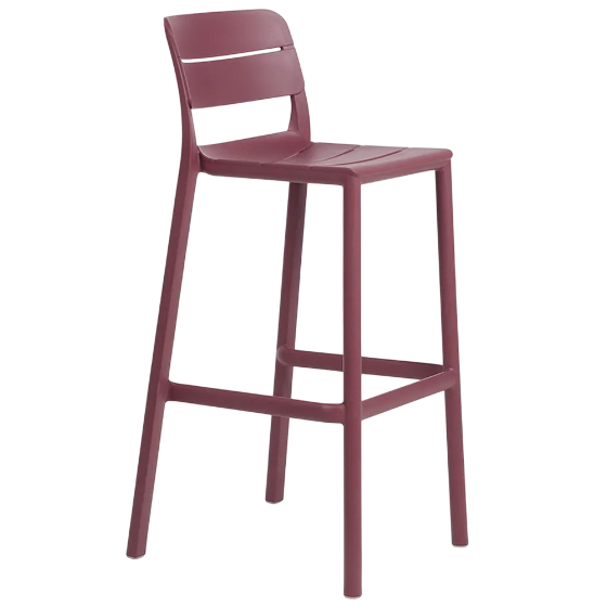 Su estructura de lamas horizontales ofrece un asiento ergonómico y estable, ideal para bares, restaurantes o terrazas domésticas. Es ligero, resistente y apilable, lo que facilita su uso en espacios flexibles y su almacenamiento.