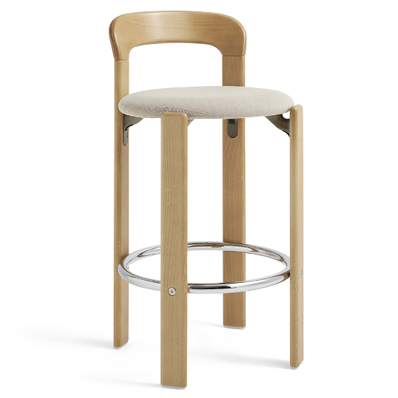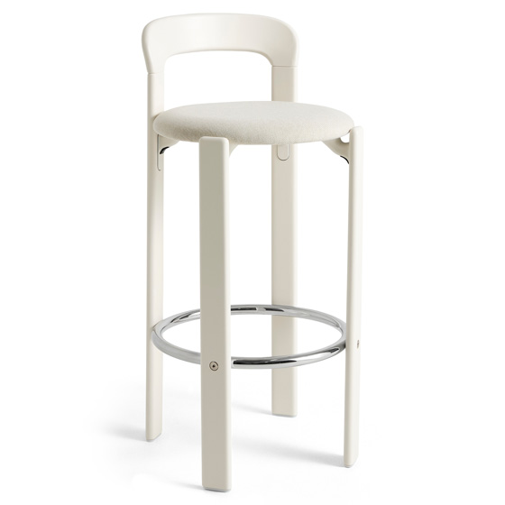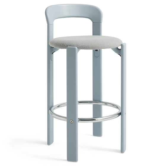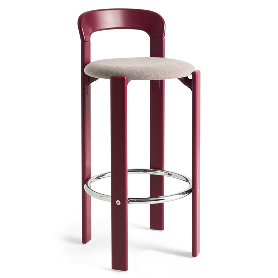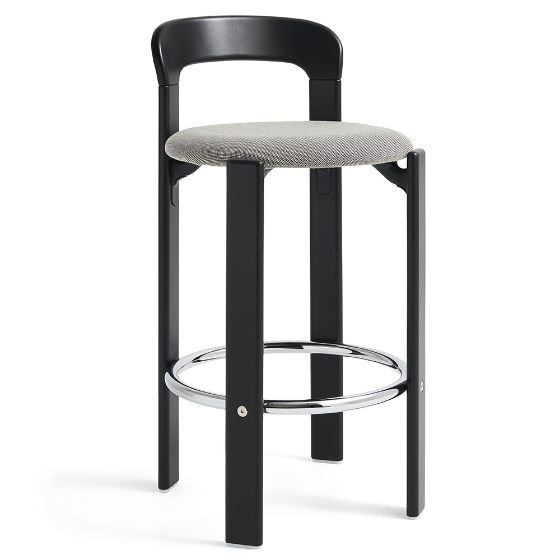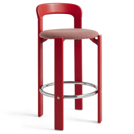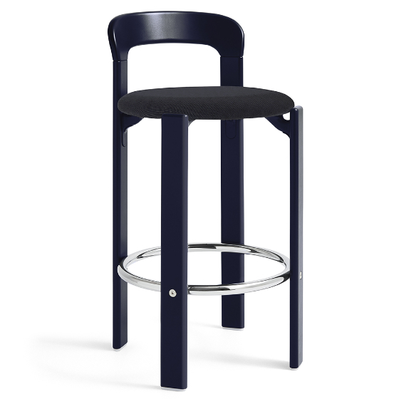 Taburete bar Rey tapizado de Sovet Italia y diseñado por Bruno Rey para HAY, en colaboración con Dietiker. Este taburete combina la estética funcional y sin tornillos de la icónica Colección Rey con una estructura en contrachapado moldeado, tapa de haya y chapa exterior. El reposapiés de acero cromado aporta comodidad adicional. Disponible en varios colores y con opciones de tapizado en Steelcut 3 o Steelcut Trio, ofrece una versatilidad ideal para espacios domésticos y públicos.