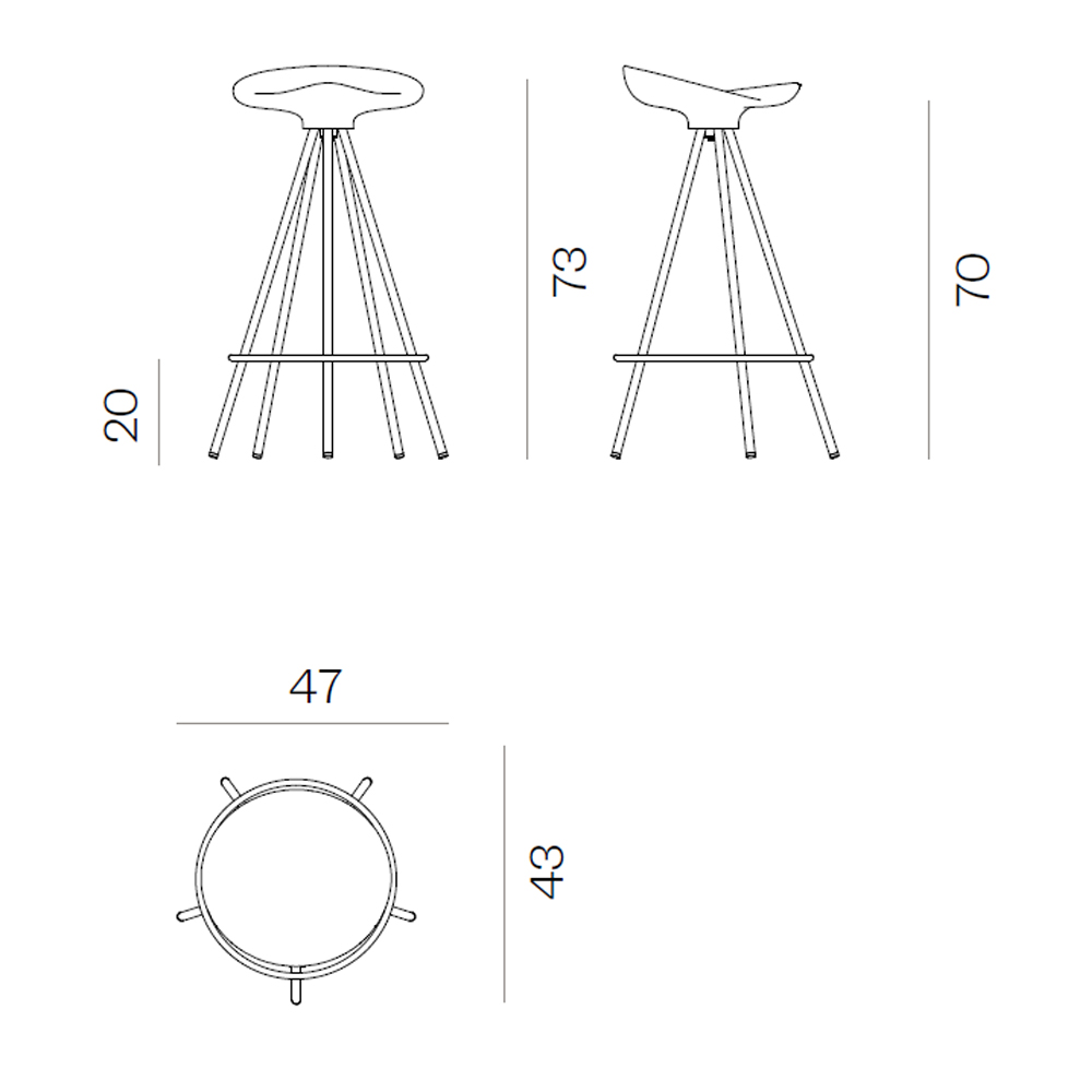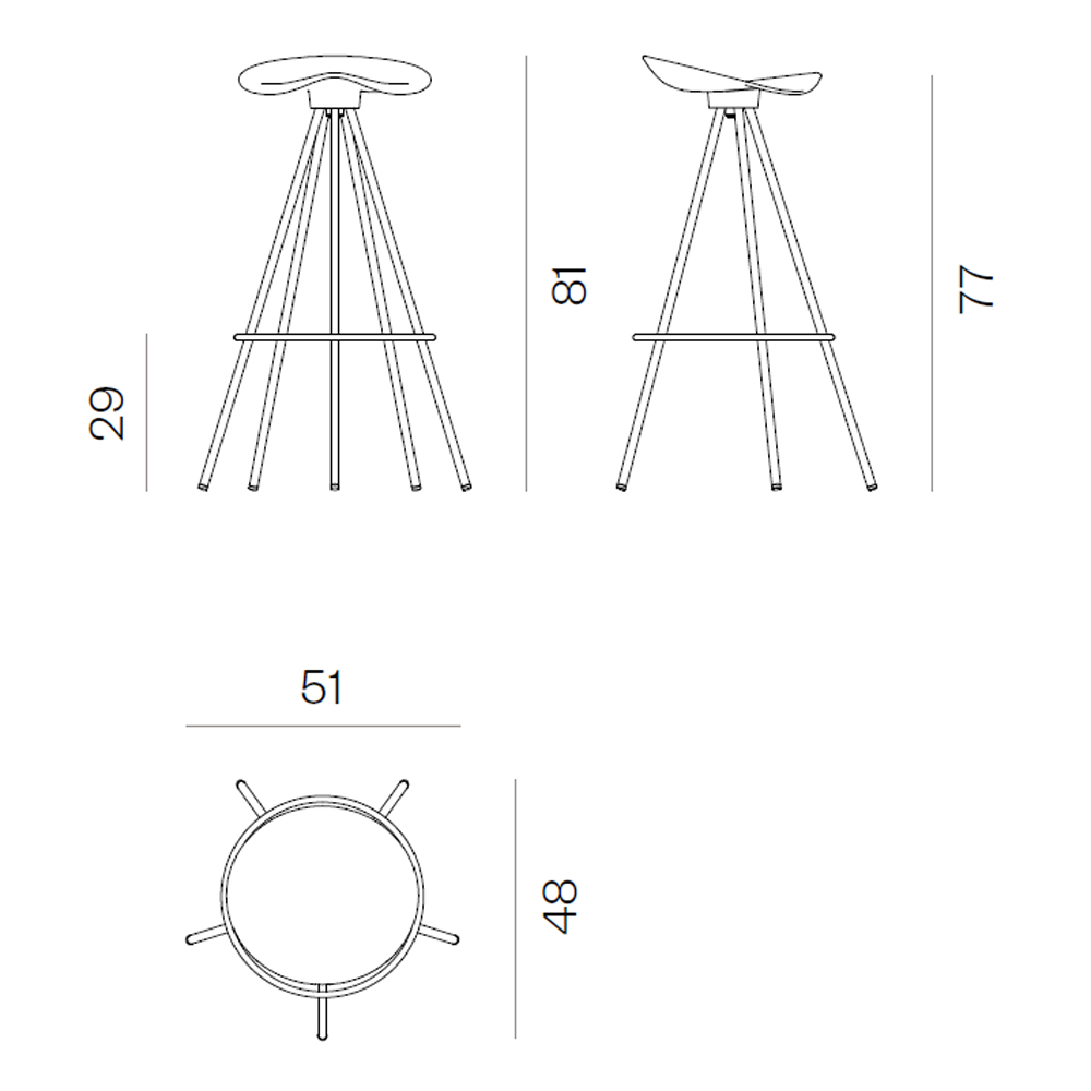 Taburete Jamaica con asiento de madera de haya o aluminio diseño de Pepe Cortés Taburete con estructura de 5 patas realizada en acero cromado.
