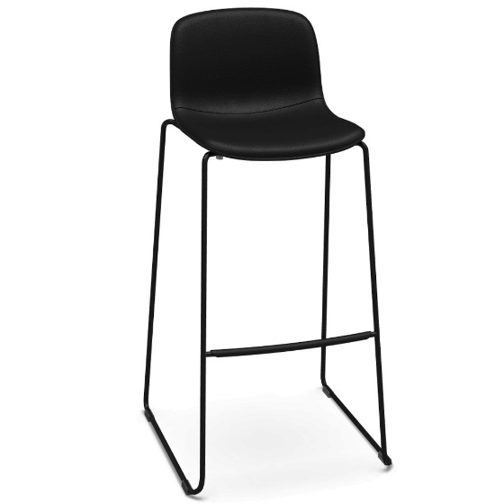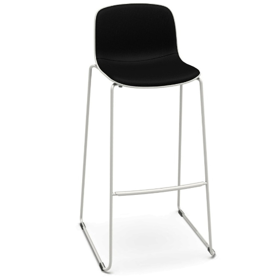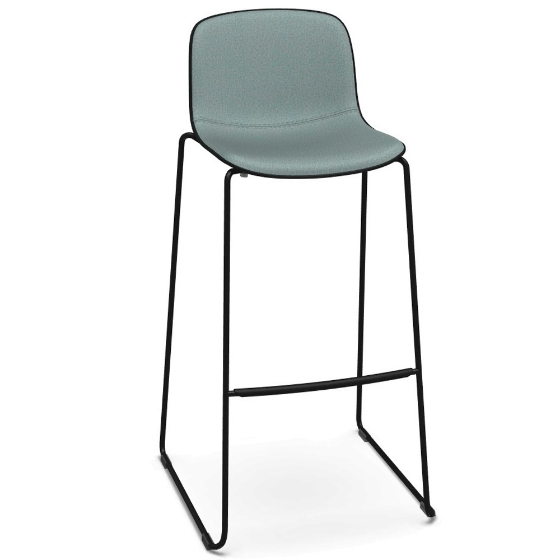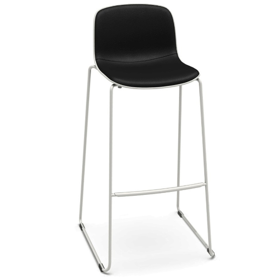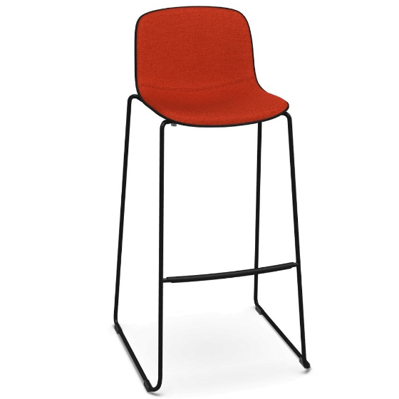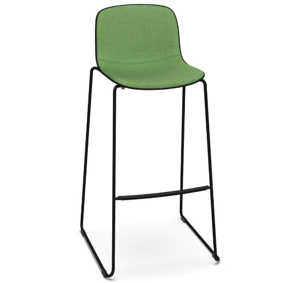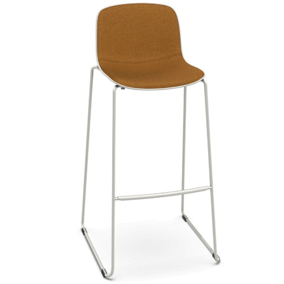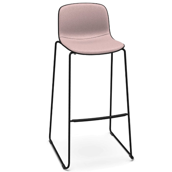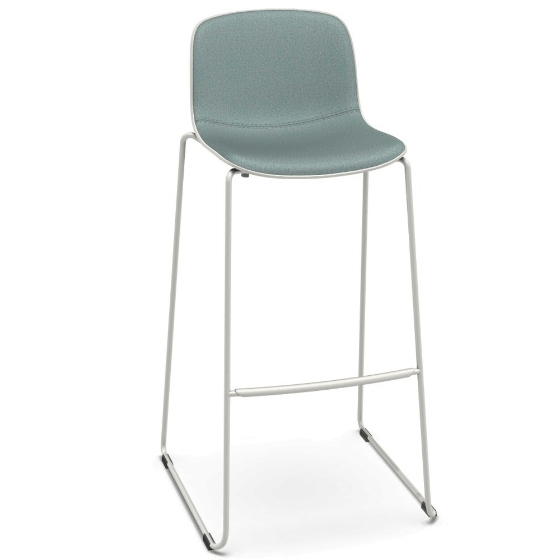 Taburete con carcasa de polipropileno con tapizado frontal y base de patín de acero.
