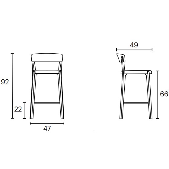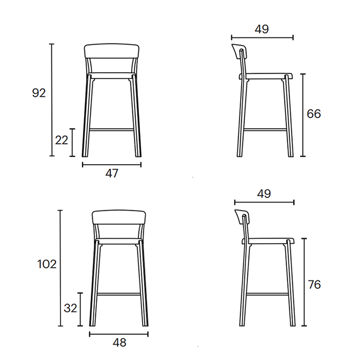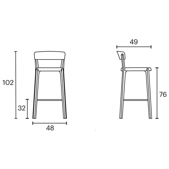 El taburete Noa de Enea está construido con una estructura de madera laminada de chapa de haya natural con unión directa al Polipropileno para mejorar su flexibilidad. El asiento y el respaldo pueden tener distintos acabados: en polipropileno monocolor. Este modelo tiene dos alturas disponibles: 65 y 75 centímetros.