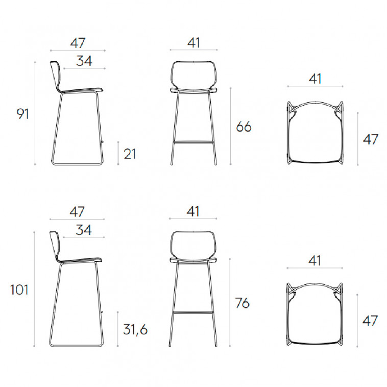 El taburete de diseño cuenta con una carcasa tapizada disponible en diferentes tejidos y colores, y una base en forma de trineo con apoyapiés, hecho de varilla de acero pintado en poliéster termoendurecida.