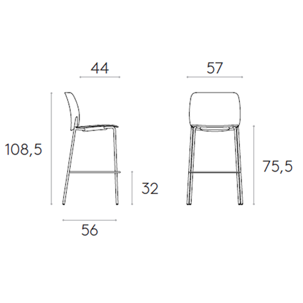 Taburete apilable con amplio respaldo tapizado y base de acero.