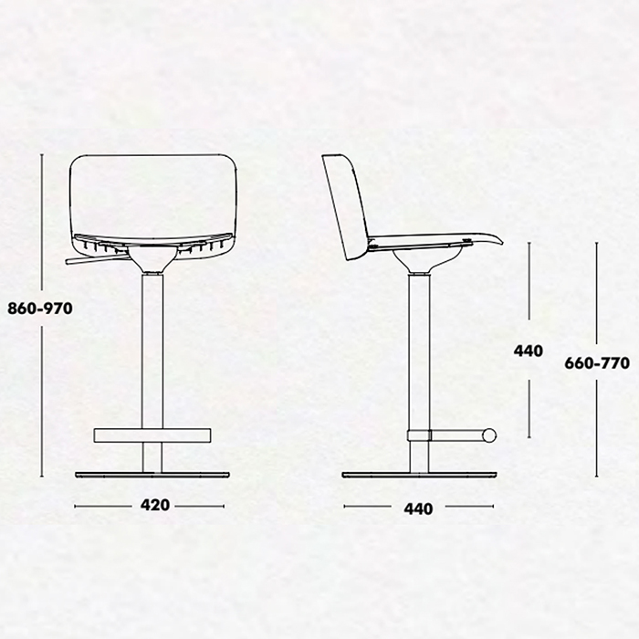 Taburete de altura regulable con reposapiés en cromo. Dimensiones: 42x44x86/97h cm.