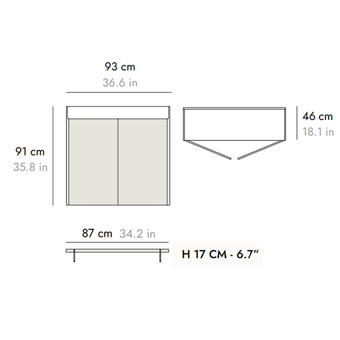 Vitrina de la colección Stockholm de Punt, ganadora del premio de diseño Red Dot 2015 con un singular acabado de aluminio en la parte superior. El mueble apoyado sobre zócalo con pies regulables.