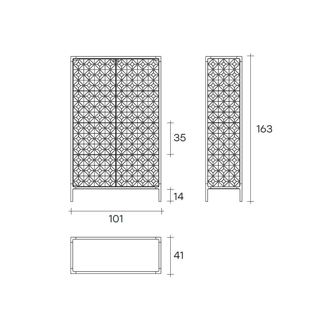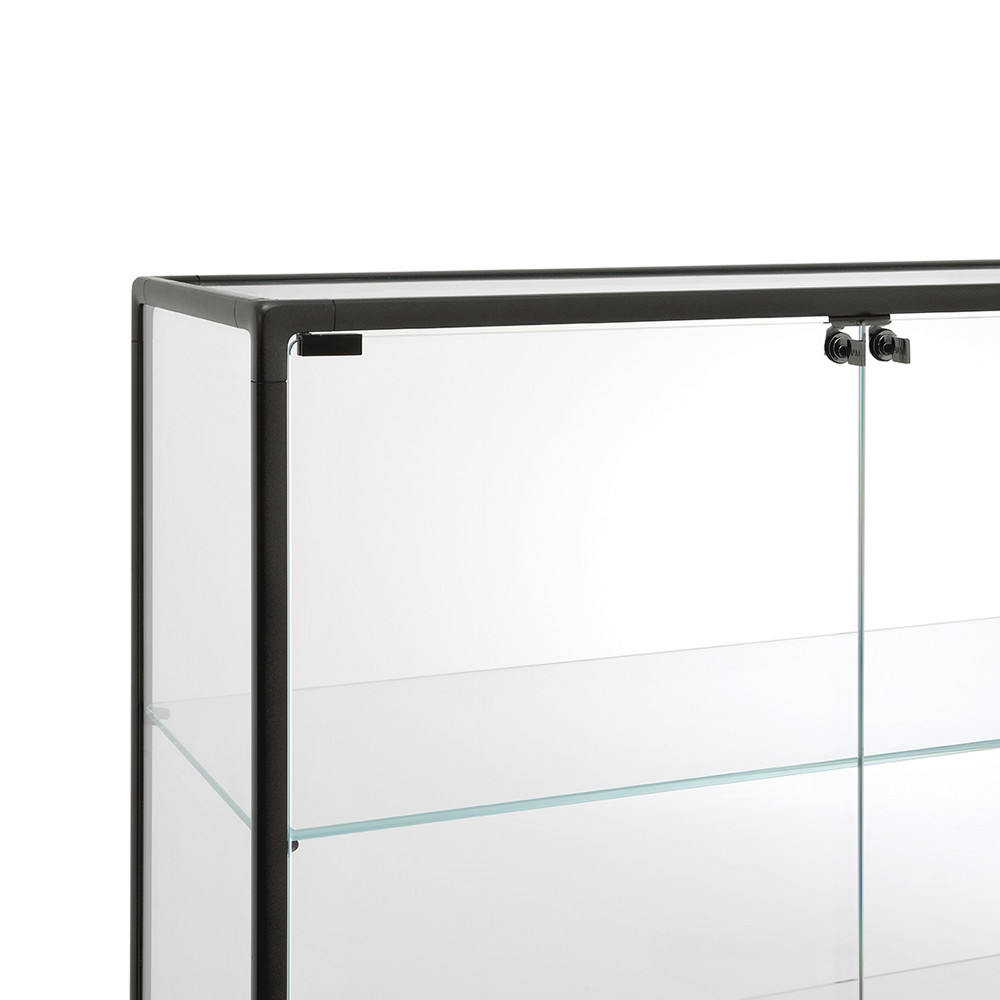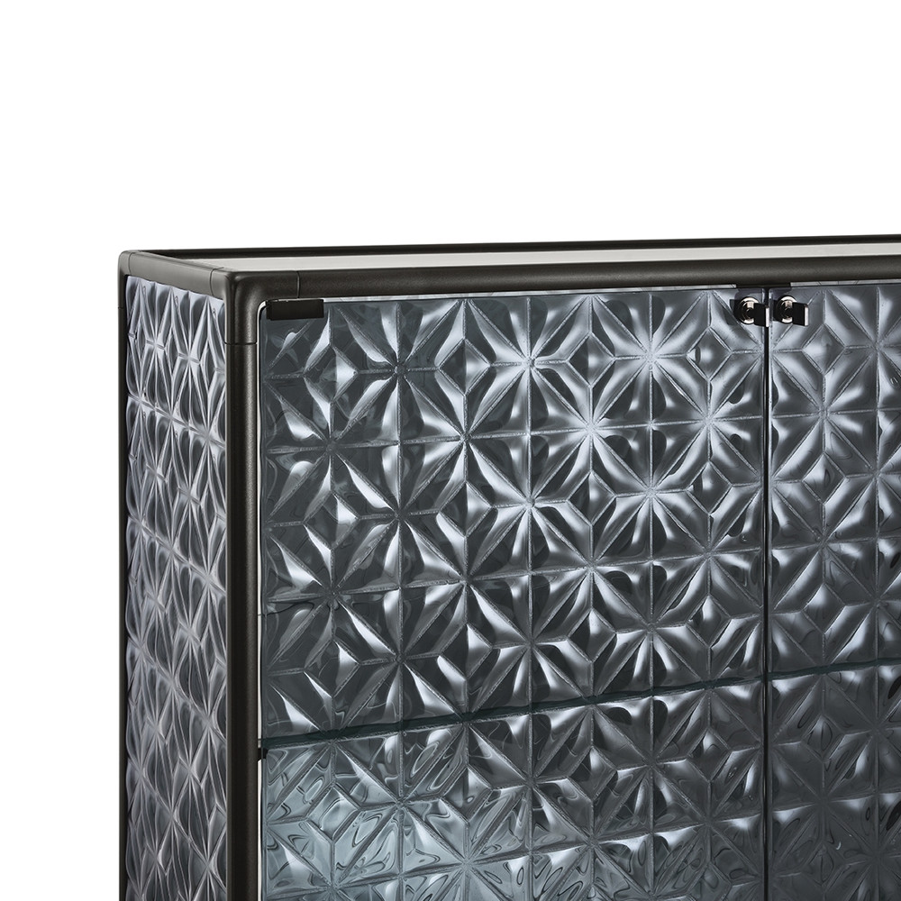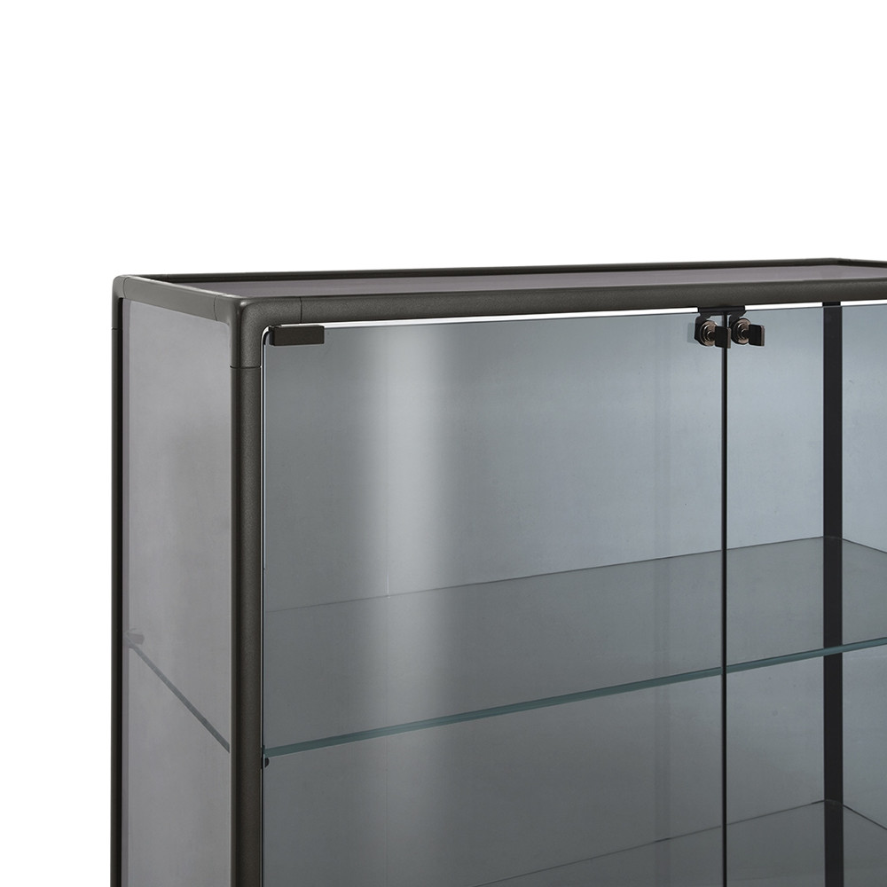 La vitrina Echo de Fiam cuenta con unos perfiles de aluminio barnizado de color champagne metalizado o gris volcán, la base está hecha en vidrio extraclaro de 6 mm templado retro barnizado en color a juego con los perfiles. Las puertas y la estructura están realizada en vidrio de 6 mm templado o fundido, y los estantes están hecho en vidrio extraclaro de 8 mm templado.