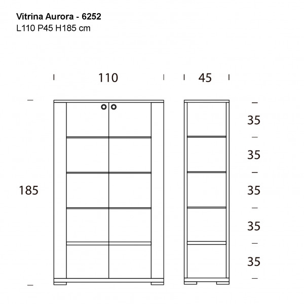 Las puertas, estantes y respaldo son transparentes (separados entre sí cada 35 cm), mientras que los costados están pintados de blanco o nogal Canaletto.